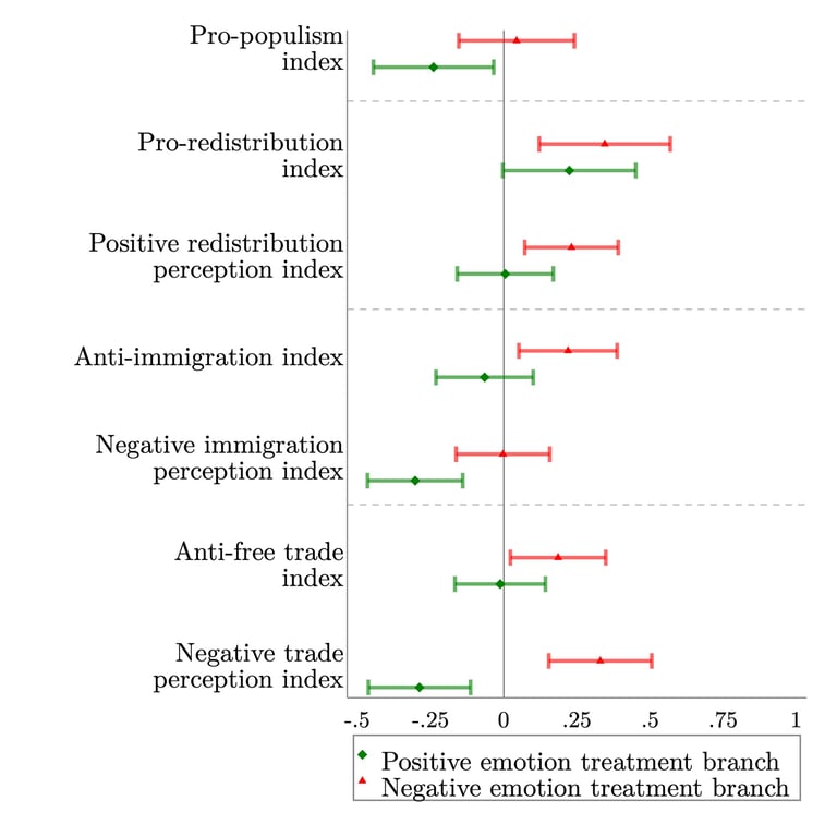 This paper investigates the growing role of emotions in shaping policy views. Analyzing citizens' social media postings and political party messaging over a variety of policy issues from 2013 to 2025, we document a sharp rise in anger on both the supply side (content provided by policy makers) and the demand side (emotional responses by citizens) since 2016. Content generating anger drives significantly more engagement. While anger in policymakers' discourse follows cycles tracking shifts in political power, anger among citizens seems to have been persistently triggered and does not revert back. We then conduct two nationwide online experiments in the U.S, exposing participants to video treatments that induce positive or negative emotions to measure their causal effects on policy views. The results show that negative emotions increase support for protectionism, restrictive immigration policies, redistribution, and climate policies but do not reinforce populist attitudes. In contrast, positive emotions have little effect on policy preferences but reduce populist inclinations. Finally, distinguishing between fear and anger, we find that anger exerts a much stronger influence on citizens’ policy views, in line with its growing presence in the political rhetoric.